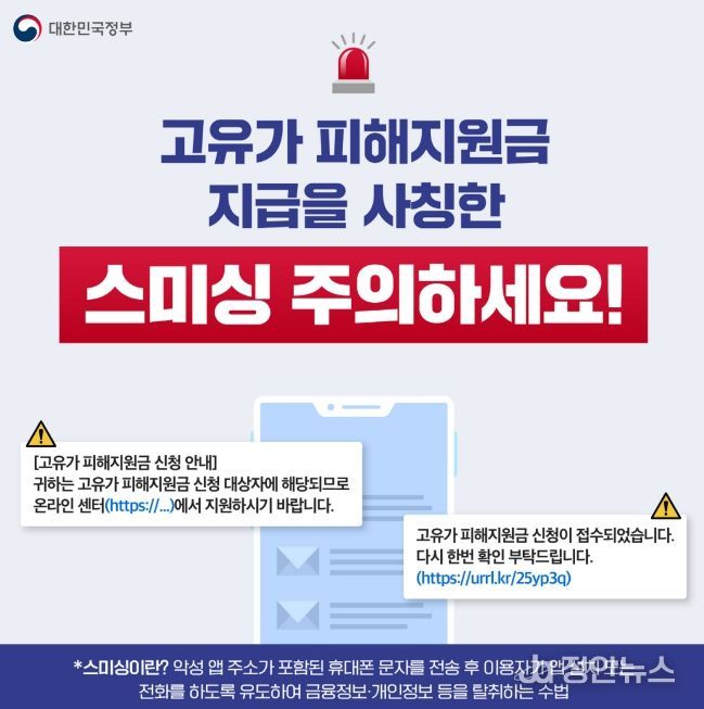 정안뉴스 안정주 기자 | 안성시가 오는 27일부터 신청하는 ‘고유가 피해지원금’ 신청을 앞두고 정부 및 지자체 등을 사칭한 스미싱 등 금융 사기에 대해 시민들의 각별한 유의를 당부했다. 시는 특히 공식 알림 서비스인 ‘국민비서’를 적극 활용해 사기 피해를 예방할 것을 권고했다.