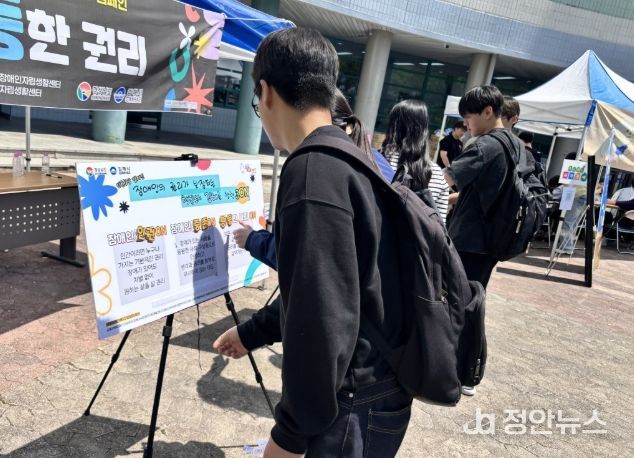 정안뉴스 김재홍 기자 | (재)김해시복지재단 김해시장애인종합복지관(관장 류재복)은 김해장애인복지기관네트워크 합동으로 지난 13일부터 15일까지 3일간 지역 내 대학생들을 대상으로 장애인식개선 캠페인 ‘동정이 아닌, 동등한 권리’을 진행했다.