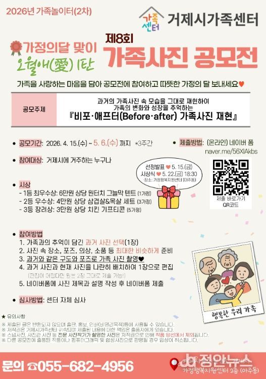 정안뉴스 김재홍 기자 | 거제시가족센터가 5월 가정의 달을 맞아 가족의 소중함을 고취하고 가족친화 문화 조성을 위해‘2026년 제8회 가족사진 공모전’을 개최한다고 밝혔다.