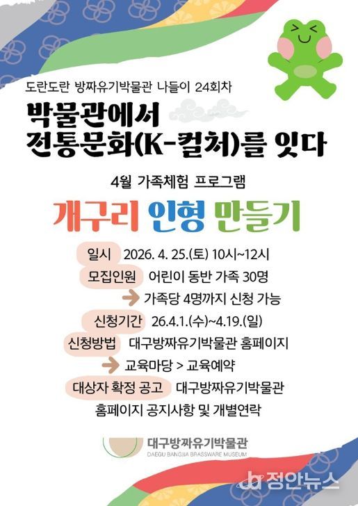 정안뉴스 안정주 기자 | 대구문화예술진흥원 박물관운영본부 소속 대구방짜유기박물관은 화창한 봄날 4월에 전통공예 가족체험과 팔공산 역사문화 이해 특강을 기획하여, 4월 25일 오전 10시에 ‘개구리 인형 만들기’ 체험을, 4월 28일 오후 2시에 ‘고려 태조 왕건 후백제 견훤과 팔공산’ 강의를 개최한다.