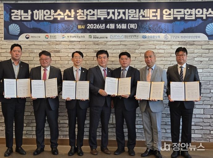 정안뉴스 김재홍 기자 | 경상국립대학교 해양과학대학은 경상남도 해양수산 창업투자 활성화를 위해 4월 16일 경남테크노파그에서 경상남도, 경남테크노파크, 경남항노화연구원, 수협중앙회 경남본부, 경상남도 청년어업인연합회 등과 업무협약(MOU)을 체결했다.