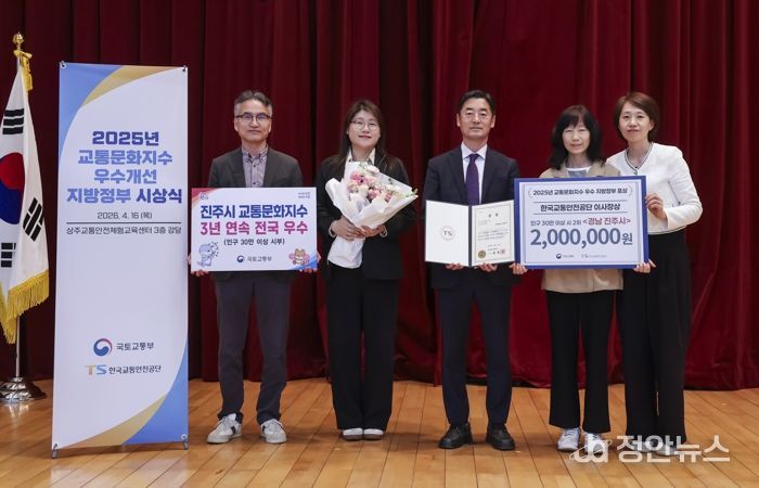 정안뉴스 김재홍 기자 | 진주시는 지난 16일 국토교통부가 주최한 ‘2025년 교통문화지수 우수 지자체 시상식’에서 인구 30만 명 이상의 시부 그룹에서 전국 2위를 차지해 3년 연속 우수 지자체로 선정돼 기관 표창을 받았다고 밝혔다.