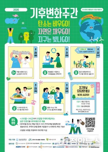 또한 ‘기후 동행 탄소중립 생활 실천 챌린지’는 20일부터 24일까지 카카오톡 채널을 이용한 온라인 실천 인증 캠페인으로 운영한다. 요일별로 다른 실천 주체를 정해 참여자들이 인증 숏을 공유하고, 추첨으로 모바일 쿠폰을 제공한다. 실천 주제는 ▲잔반 제로(Zero) ▲다회용품 사용 ▲친환경 이동 ▲소등 행사 참여 ▲채식 ▲물품 기부 등이다.