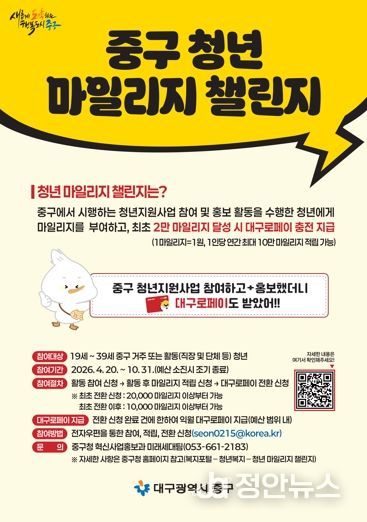 정안뉴스 안정주 기자 | 대구 중구는 청년들의 청년지원사업 참여를 확대하고 정책 인지도와 체감도를 높이기 위해 ‘청년 마일리지 챌린지’를 4월 20일부터 10월 31일까지 시행한다.