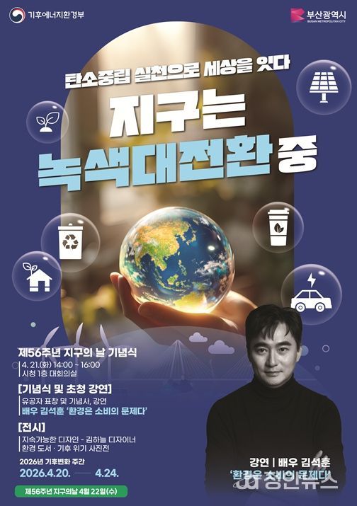 정안뉴스 안정주 기자 | 부산시는 '제56주년 지구의 날(4월 22일)'을 맞아 오늘(20일)부터 24일까지 '제18회 기후변화주간'을 운영하고, '지구는 녹색대전환 중. 탄소중립 실천으로 세상을 잇다'를 주제로 다양한 행사를 개최한다고 밝혔다.