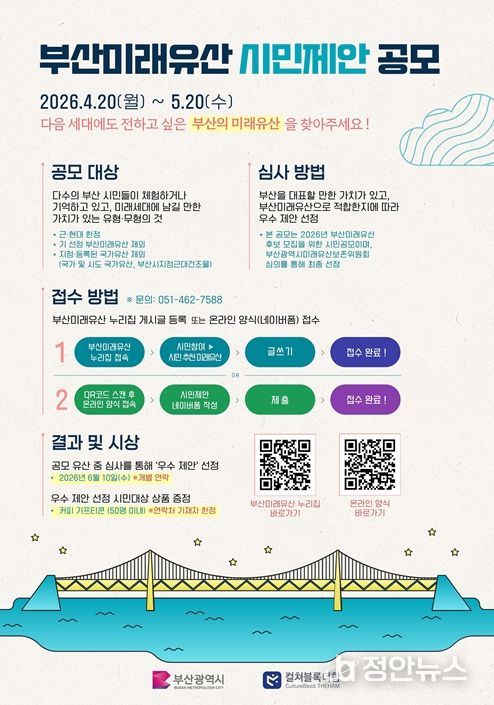접수는 부산미래유산 누리집에서 게시글을 작성하거나, 큐알(QR)코드 온라인 양식을 통해 할 수 있으며, 우수 제안자에게는 커피 기프티콘(50명 이내)을 제공할 예정이다.
