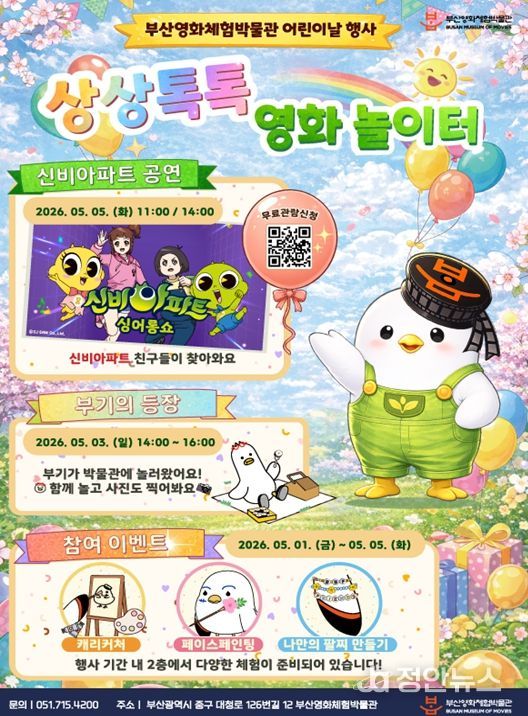 정안뉴스 안정주 기자 | 부산시는 부산영화체험박물관(관장 박채성, 중구 소재)에서 어린이날을 맞아 어린이와 가족 관람객을 위한 특별 행사 '상상톡톡 영화 놀이터 : 다 같이 놀자!'를 오는 5월 1일부터 5일까지 5일간 개최한다고 밝혔다.