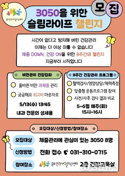 모집 대상은 체중 관리에 관심이 있는 30~50대 성인 8명으로, 전화를 통해 신청할 수 있으며, 선착순으로 마감된다.