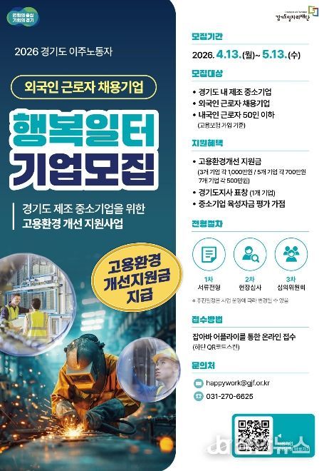 정안뉴스 안정주 기자 | 경기도와 경기도일자리재단은 도내 외국인 근로자를 고용한 중소 제조기업을 대상으로 ‘2026년 경기도 이주노동자 행복일터 선정사업’ 참여기업을 모집한다고 20일 밝혔다.