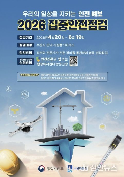 정안뉴스 안정주 기자 | 수원특례시가 안전사고를 예방하고, 시민의 안전 의식을 고취하기 위해 20일부터 6월 19일까지 ‘2026년 집중안전점검’을 한다.