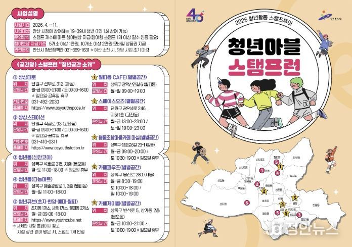 정안뉴스 안정주 기자 | 안산시는 청년의 시정 참여를 확대하고 청년공간과 정책에 대한 접근성을 높이기 위해 청년활동 스탬프투어 ‘청년마블 스탬프런’ 사업을 운영한다고 20일 밝혔다.