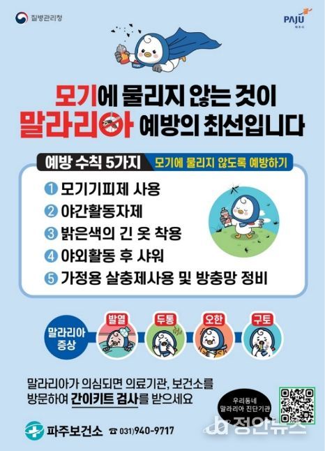 이한상 파주보건소장은 “발열이나 오한 등 감기 증상이 나타날 경우, 가까운 말라리아 진단기관이나 보건소를 방문해 신속히 검사받는 것이 중요하다”라며 “앞으로도 촘촘한 감염병 안전망을 구축해 시민의 건강과 일상을 안전하게 지켜나가겠다”라고 강조했다.