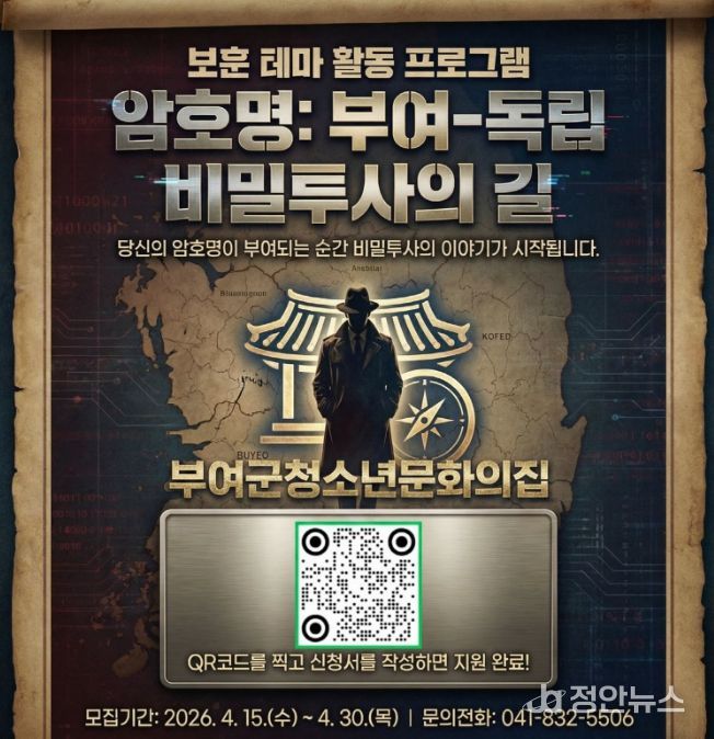 정안뉴스 안정주 기자 | 부여군시설관리공단 청소년문화의집은 국가보훈부 공모사업에 선정된 2026년 보훈 테마 활동 프로그램 '암호명 부여-독립 비밀투사의 길'에 참여할 청소년을 4월 30일까지 모집한다.
