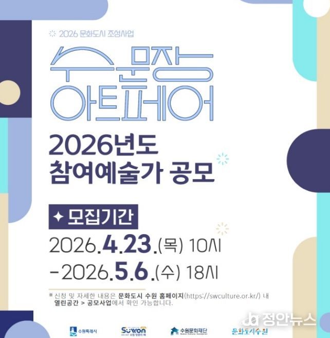정안뉴스 안정주 기자 | 수원문화재단은 지역 예술가의 작품 판로 확대와 지속가능한 창작 활동 기반 마련을 위해 2026년 ‘수문장 아트페어’ 참여 예술가를 모집한다.