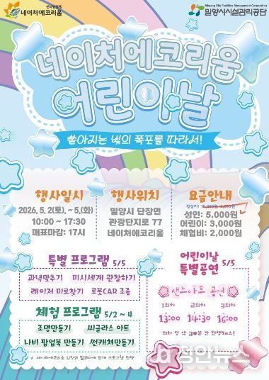 정안뉴스 김재홍 기자 | 밀양시시설관리공단(이사장 김경민)은 오는 5월 2일부터 5일까지 어린이날을 맞아 선샤인 밀양 테마파크 내 네이처에코리움에서 가족 단위 방문객을 위한 ‘제3회 네이처에코리움 어린이날 행사’를 개최한다.