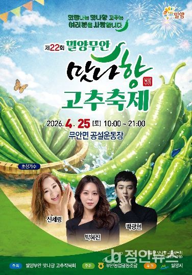 정안뉴스 김재홍 기자 | 경남 밀양시는 오는 25일 무안면 공설운동장 일원에서 ‘제22회 밀양무안맛나향 고추 축제’를 개최한다.