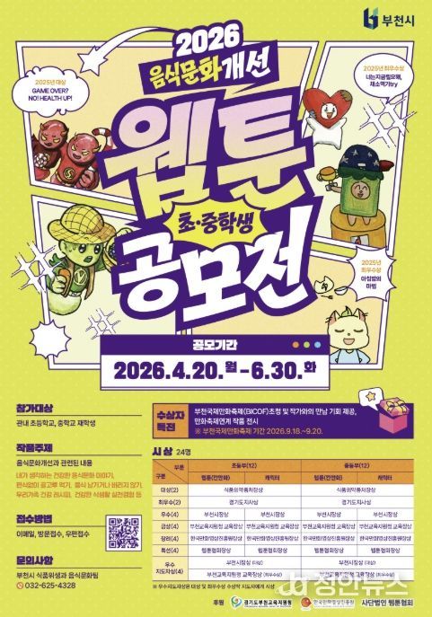 정안뉴스 안정주 기자 | 부천시는 4월 20일부터 6월 30일까지 ‘2026년 음식문화개선 초중학생 웹툰·캐릭터 공모전’을 연다. 이번 공모전은 학생들이 일상 속 음식문화를 주제로 직접 창작에 참여함으로써 올바른 식문화에 대한 인식을 높이기 위해 매년 추진되고 있다.