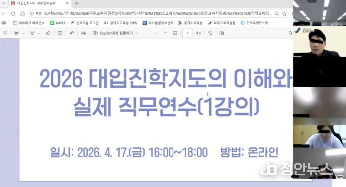 정안뉴스 안정주 기자 | 경기도파주교육지원청은 급변하는 대입 환경에 발맞추어 교원의 대입진학지도 전문성을 높이고 학생 맞춤형 진학 교육을 실현하기 위하여 '2026 대입진학지도의 이해와 실제 직무연수'를 운영한다.