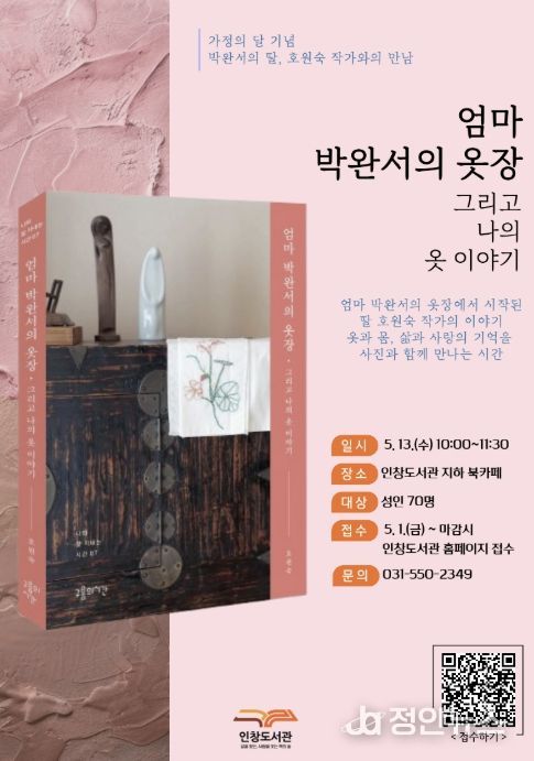 정안뉴스 안정주 기자 | 구리시립도서관은 '호원숙 작가와의 만남 ‘엄마 박완서의 옷장, 그리고 나의 이야기’' 참여 신청을 오는 5월 1일부터 접수한다고 밝혔다.