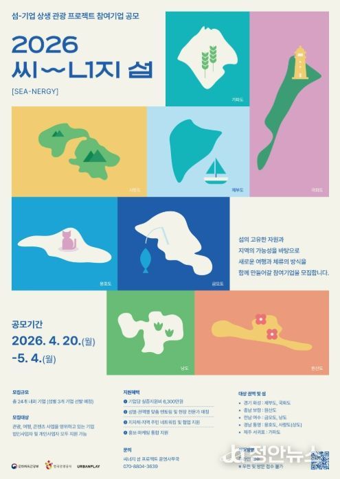 정안뉴스 김재홍 기자 | 문화체육관광부가 주최하고 한국관광공사가 주관한 2026년 씨너지『섬-기업 상생 관광프로젝트』 참여기업 공모를 오는 4월 20일 월요일 부터 5월 4일 월요일까지 모집한다.