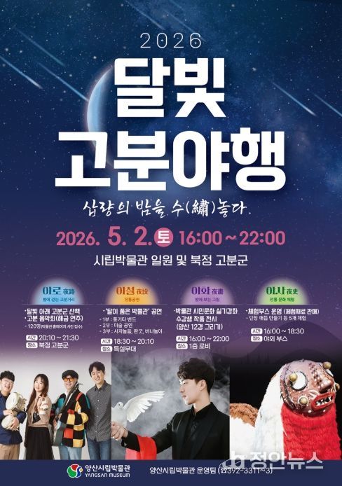 정안뉴스 김재홍 기자 | 양산시립박물관(관장 신용철)은 5월 2일 박물관과 북정 고분군(사적 제93호) 일대에서 ‘2026 달빛 고분 야행(夜行)’을 개최한다고 밝혔다.