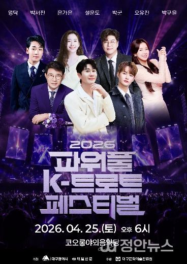 정안뉴스 안정주 기자 | 대구광역시는 오는 4월 25일 오후 6시, 코오롱 야외음악당에서 ‘2026 파워풀 K-트로트 페스티벌’을 개최한다.