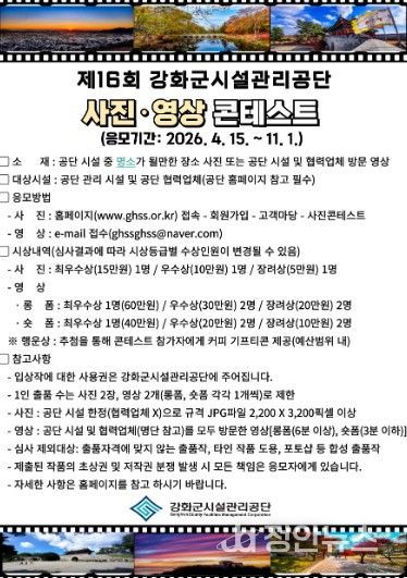 정안뉴스 안정주 기자 | 강화군시설관리공단이 ‘제16회 강화군시설관리공단 사진·영상 콘테스트’를 개최한다.