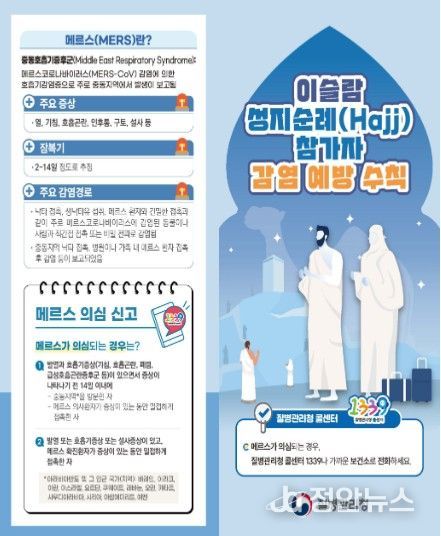 정안뉴스 안정주 기자 | 질병관리청은 이슬람 성지순례(하지, Hajj, 2026년 5월 25일~5월 30일 변동 가능) 시기를 맞아 사우디아라비아 방문객들에게 중동호흡기증후군(Middle East Respiratory Syndrome, 메르스) 및 수막구균 감염증(Meningococcal disease)을 주의할 것을 당부했다.