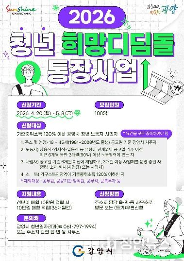 정안뉴스 안정주 기자 | 광양시는 전라남도와 함께 청년의 자산 형성과 미래 준비를 지원하기 위해 ‘2026년 청년 희망디딤돌 통장사업’ 참여자를 모집한다고 밝혔다.