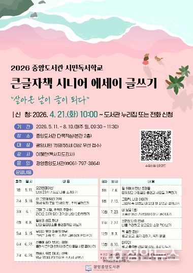 정안뉴스 안정주 기자 | 광양중앙도서관은 2026년 시민독서학교의 하나로 '큰글자책 시니어 에세이 글쓰기' 프로그램을 운영하고 참여자를 모집한다고 밝혔다.
