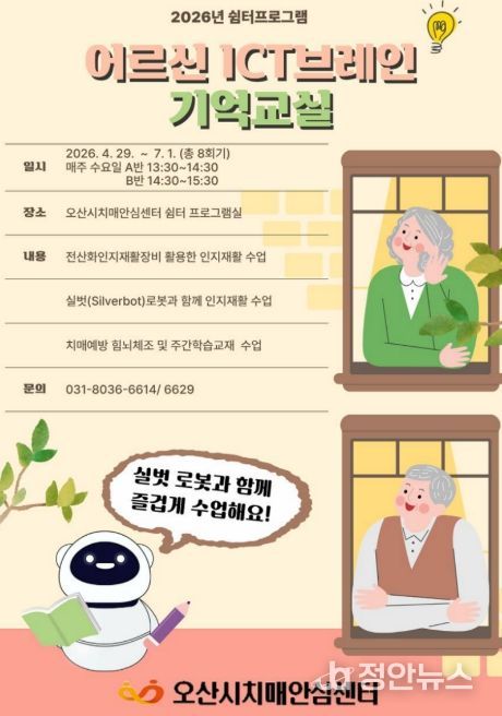 정안뉴스 안정주 기자 | 오산시치매안심센터는 오는 4월 29일부터 경증 치매환자를 위한 쉼터 프로그램 ‘ICT 브레인 기억 교실’을 운영한다고 밝혔다.