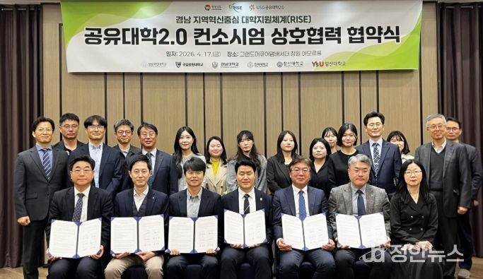정안뉴스 김재홍 기자 | 경상국립대학교 라이즈(RISE) 사업단 지역교육혁신센터는 4월 17일 창원 그랜드머큐어호텔에서 ‘공유대학2.0 컨소시엄 과제’ 참여대학 간 상호 협력 협약(MOU)을 체결했다.