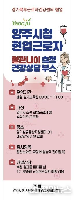 건강상담 부스는 오는 4월 22일 오전 9시, 양주시 소속 현업근로자 및 수탁기관 근로자 400여 명을 대상으로 하는 정기 안전보건교육 현장(경기섬유종합지원센터 지하 1층 대강당 로비)에서 첫선을 보인다.