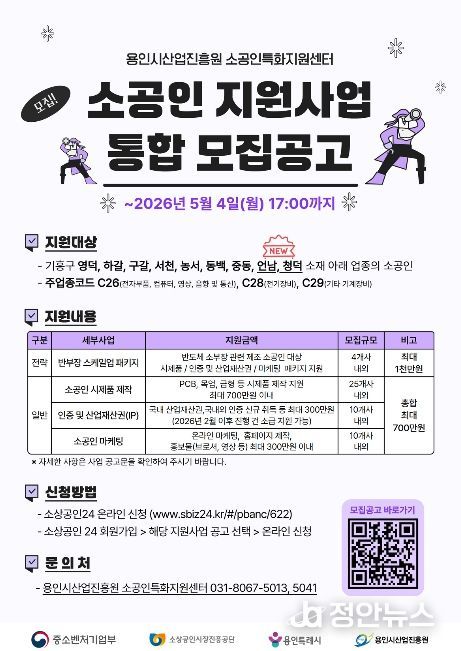 정안뉴스 안정주 기자 | 용인시산업진흥원 소공인특화지원센터는 용인시 소재 소공인의 경쟁력 강화를 위해 소공인 지원사업을 본격 추진하고, 참여기업 총 49개사를 모집한다고 밝혔다.