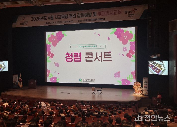 정안뉴스 안정주 기자 | 대구시교육청은 4월 20일 오후 2시 30분부터 대구학생문화센터 대공연장에서 교직원 및 관리자 등을 대상으로 ‘청렴콘서트’를 개최했다.