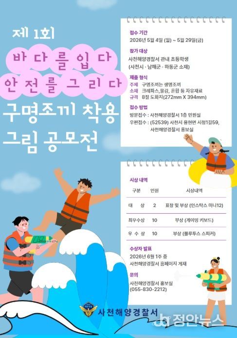 정안뉴스 김재홍 기자 | 사천해양경찰서는 제1회 '바다를 입다 안전을 그리다' 구명조끼 착용 그림 공모전을 개최한다고 20일(월) 밝혔다.