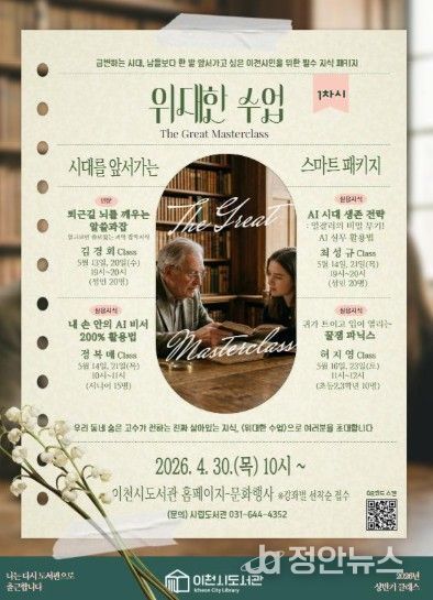 정안뉴스 안정주 기자 | 이천시립도서관은 오는 4월 30일부터 2026년 상반기 시민강사 프로그램 ‘위대한 수업’의 1차 수강생을 모집한다고 밝혔다.