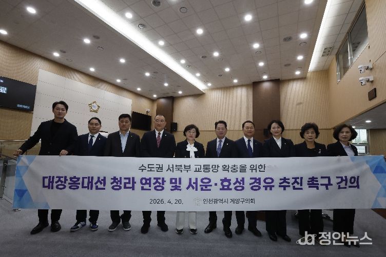정안뉴스 안정주 기자 | 인천 계양구의회 여재만 의원(국민의힘)이 대표 발의한 '수도권 서북부 교통망 확충을 위한 대장홍대선 청라 연장 및 서운·효성 경유 추진 촉구 건의안'이 지난 20일 열린 제265회 임시회 제1차 본회의에서 원안 가결됐다.