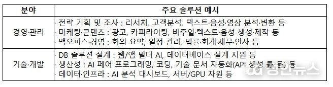국내 유망 AI 벤처·스타트업을 대상으로 3월 9일부터 27일까지 AI 솔루션을 공모하여 총 370개를 접수했고, 접수된 370개 중 전략 기획, 마케팅·경영 등 ‘경영·관리 분야’에 270여개, 데이터·인프라, 프로그래밍 등 ‘기술·개발’ 분야에 100여개가 모집됐다.