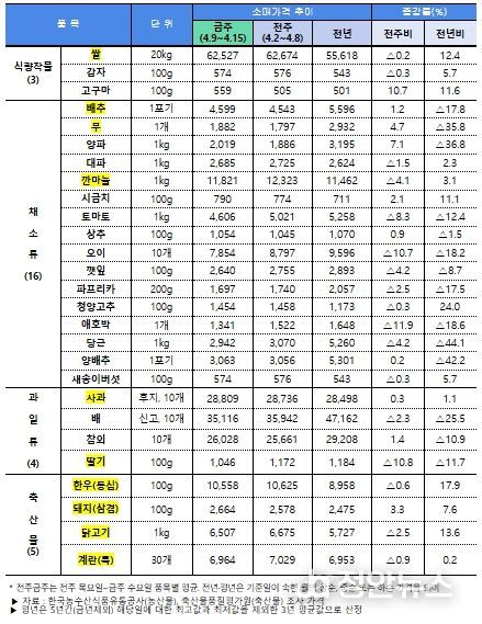 점검 결과, 농산물은 대다수 품목이 전년 대비 낮은 수준이다. 특히, 양파, 양배추, 당근 등 노지채소류는 가격이 큰 폭으로 하락함에 따라 시장격리, 정부 비축물량 출하정지와 함께 소비촉진을 추진하고 있다.