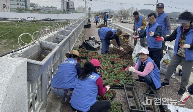 정안뉴스 안정주 기자 | 아산시 온양4동 주민자치회는 지난 17일 민관협력형 사업의 일환으로 실옥교 난간에 봄꽃 식재 활동을 펼쳤다.
