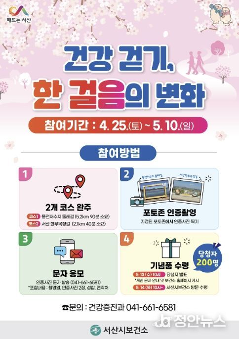 김용란 서산시보건소장은 “걷기는 누구나 쉽게 실천할 수 있는 가장 효과적인 신체활동”이라며 “지난해에 이어 마련한 이번 행사에 많은 시민이 참여해 봄 길을 걸으며 건강도 챙기시길 바란다”라고 말했다.