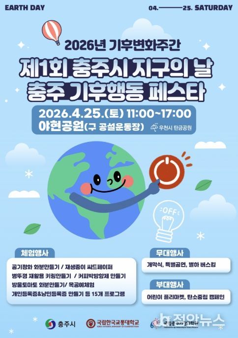 정안뉴스 안정주 기자 | 충주시는 25일 오전 11시 야현공원(구 공설운동장) 일원에서 ‘2026년 기후변화주간’을 기념해 ‘제1회 충주시 지구의 날’ 행사를 개최한다고 21일 밝혔다.