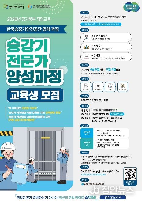 정안뉴스 안정주 기자 | 경기도일자리재단은 승강기 전문 인력 양성을 통해 일자리 문제 해결과 지역경제 활성화를 추진하고자 ‘2026년 승강기 전문가 양성 과정’ 교육생을 모집한다고 21일 밝혔다.