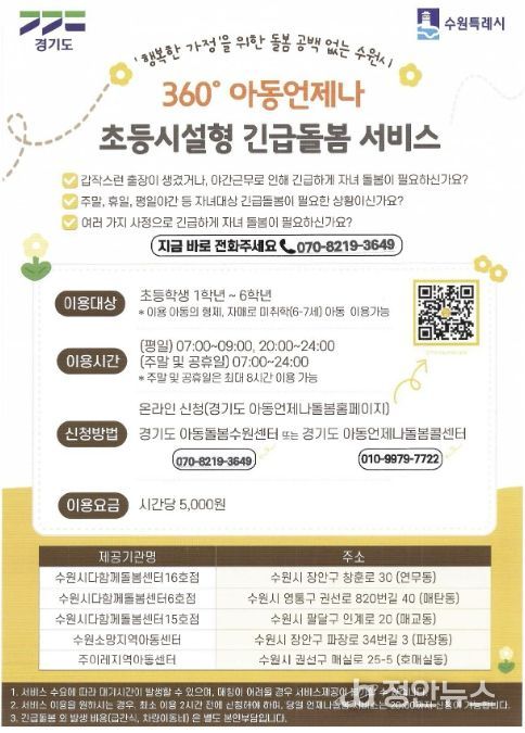 ‘초등시설형 긴급돌봄 서비스’는 갑자기 아동 돌봄이 필요할 때 요긴하다. 예상하지 못했던 출장이나 야근으로 퇴근이 예정보다 늦어지는 경우와 같은 돌발 상황에 모두 이용할 수 있다. 주말이나 휴일, 자정까지의 야간 시간 등은 물론 등교 전인 오전 7시부터 서비스를 제공한다. 장안구 2곳(연무동, 파장동), 권선구 1곳(호매실동), 팔달구 1곳(매교동), 영통구 1곳(매탄동) 등 총 5개 돌봄 기관에서 최대 8시간을 맡아준다. 경기도 아동언제나돌봄 홈페이지에서 온라인 신청할 수 있고, 경기도아동돌봄수원센터에 전화 신청할 수도 있다. 이용요금은 시간당 5천원이다.