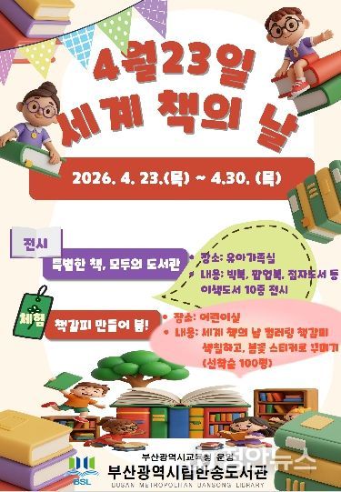 정안뉴스 안정주 기자 | 부산광역시립반송도서관은 세계 책의 날(4월 23일)을 맞아 오는 23일부터 30일까지 도서관 어린이실에서 유아와 초등학생을 대상으로 독서 문화 프로그램을 운영한다.