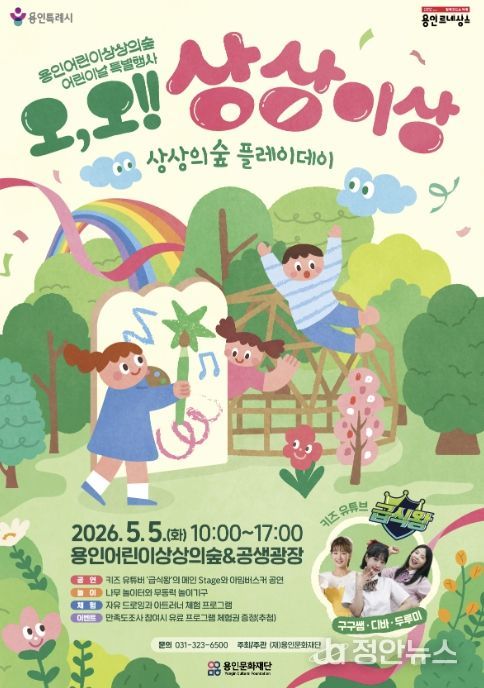 정안뉴스 안정주 기자 | 용인문화재단은 오는 5월 5일 어린이날을 맞아 용인어린이상상의숲에서 2026년 어린이날 특별행사 ‘오, 오! 상상이상’을 개최한다고 밝혔다.