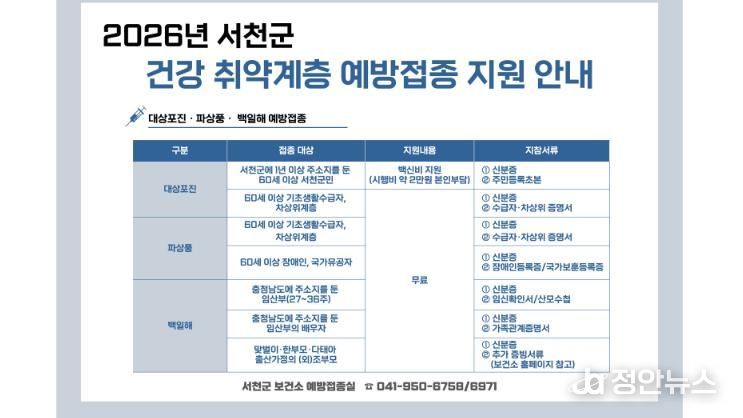 정안뉴스 안정주 기자 | 서천군은 고령층과 임산부 등 건강 취약계층을 대상으로 대상포진, 백일해, 파상풍 예방접종 지원사업을 추진하는 가운데 올해 백일해와 파상풍 예방접종 지원 대상을 확대한다고 밝혔다.