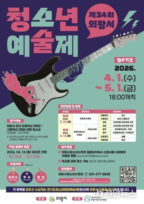 장원호 의왕시청소년예술제 담당자는 “청소년들이 주도적으로 참여하는 예술 활동을 통해 자신의 재능을 마음껏 펼칠 수 있는 기회가 되길 바란다”며 “관내 청소년들의 많은 관심과 참여를 기대한다”고 전했다.