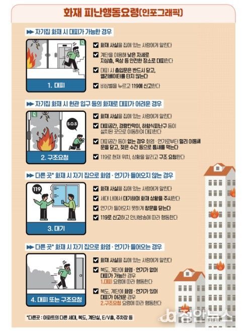 정안뉴스 안정주 기자 | 소방청은 최근 아파트 화재가 잇따라 발생함에 따라, 인명피해를 최소화하기 위해 무리한 대피보다는 화재 상황을 먼저 판단하고 행동하는 상황별 피난 행동요령을 철저히 준수해 줄 것을 당부한다고 17일 밝혔다.